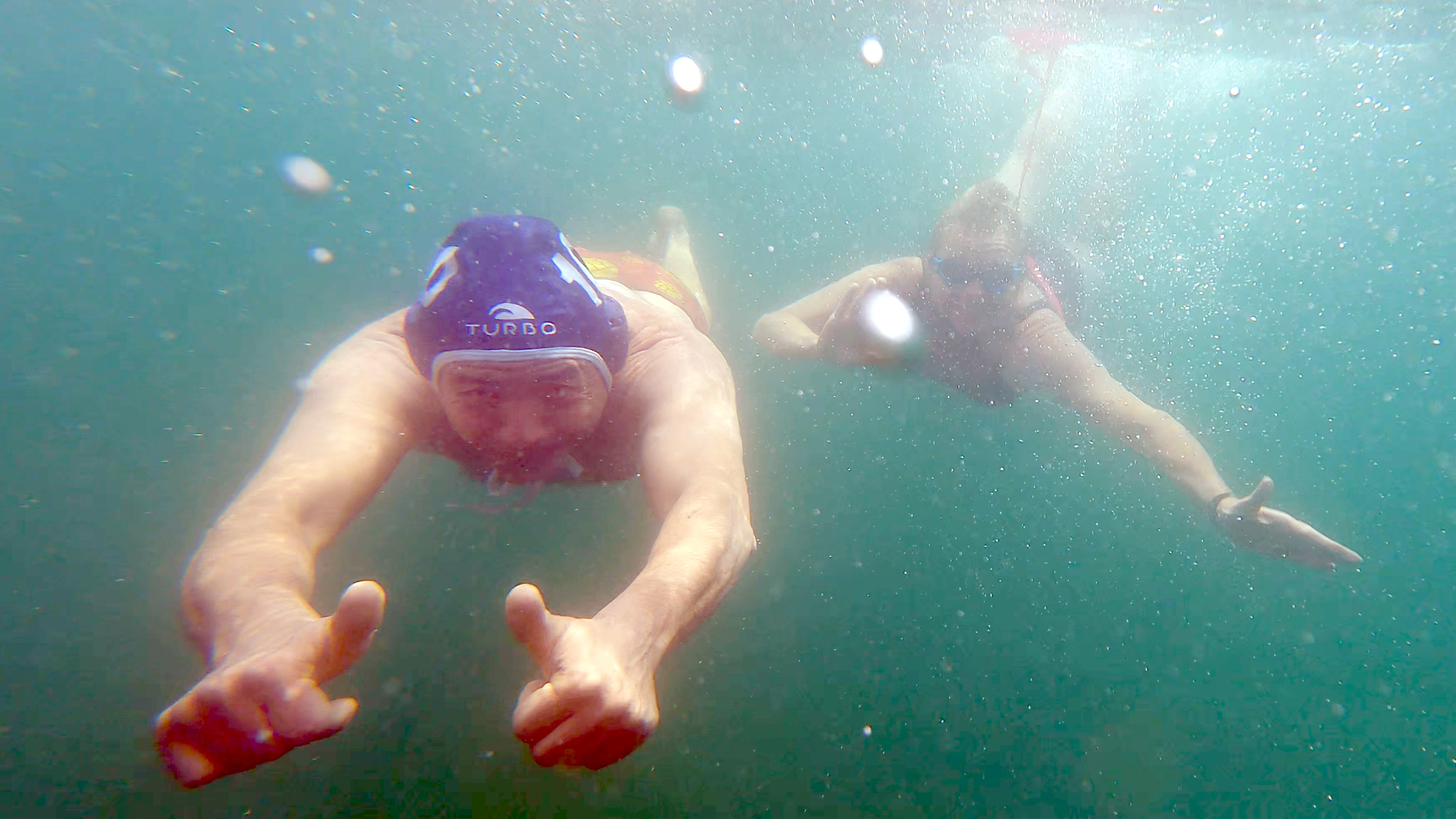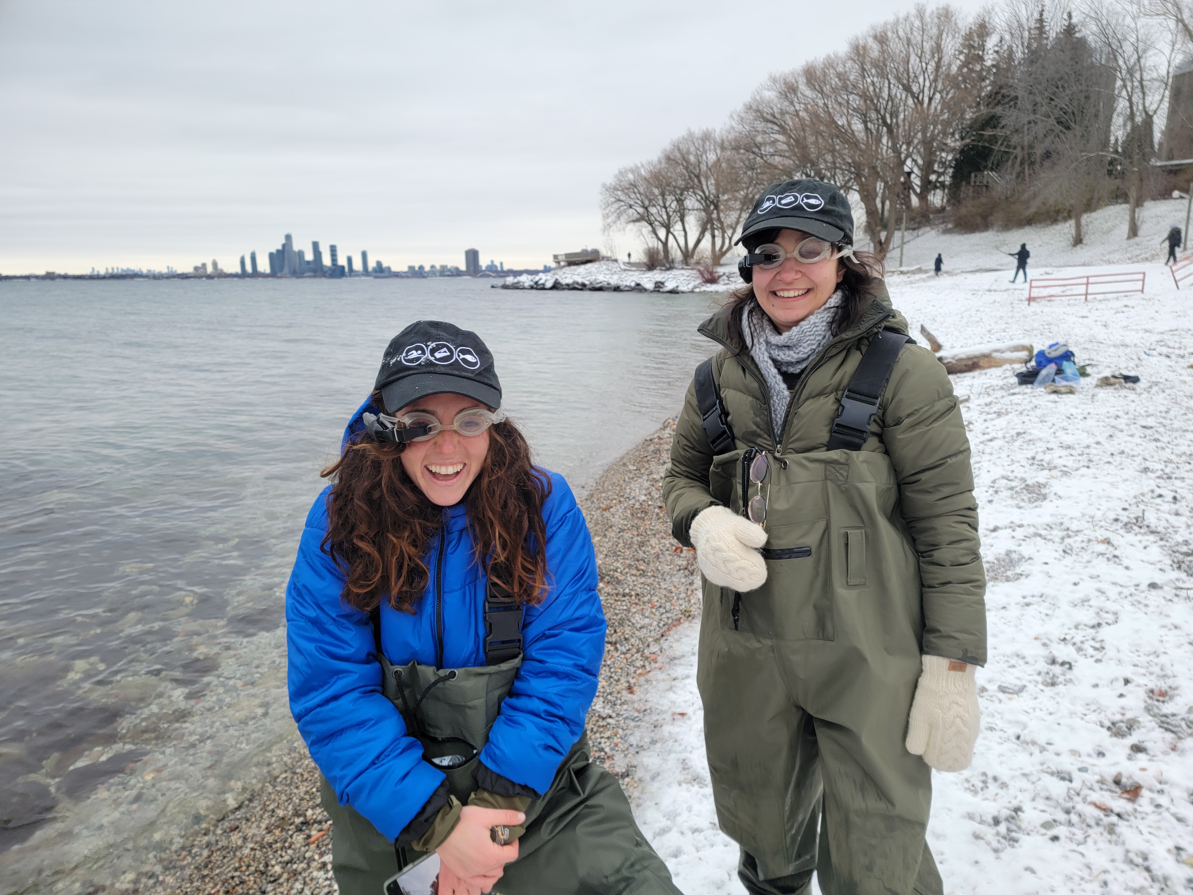 Two staff members from Swim Drink Fish doing water sampling and testing out the SmartSwim augmented reality eyeglasses: